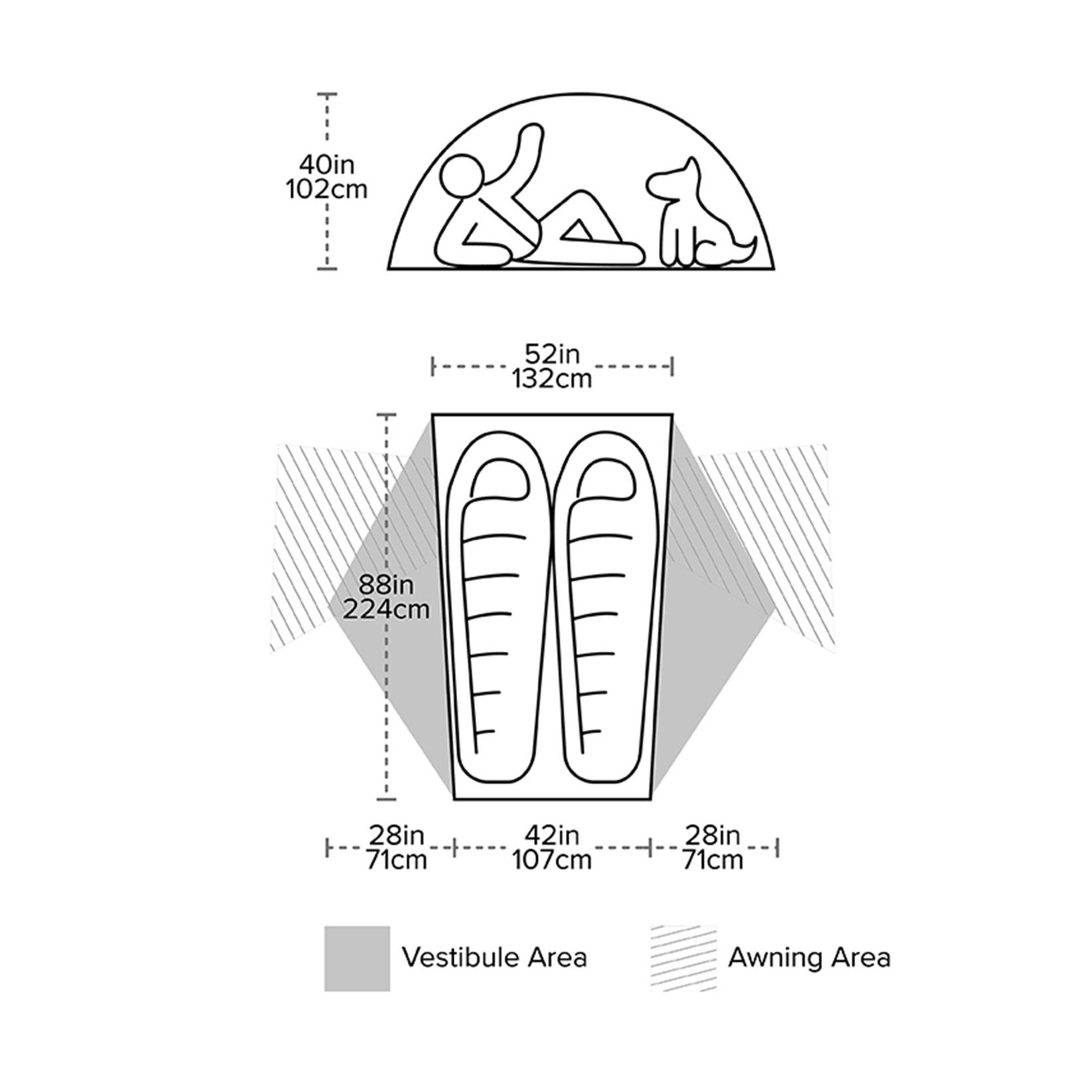 Podłoga namiotu (nie jest częścią zestawu) jest rozszerzona i tworzy podłogę także w przedsionkach. Możesz w nich przechowywać sprzęt bez konieczności kładzenia go bezpośrednio na ziemi.