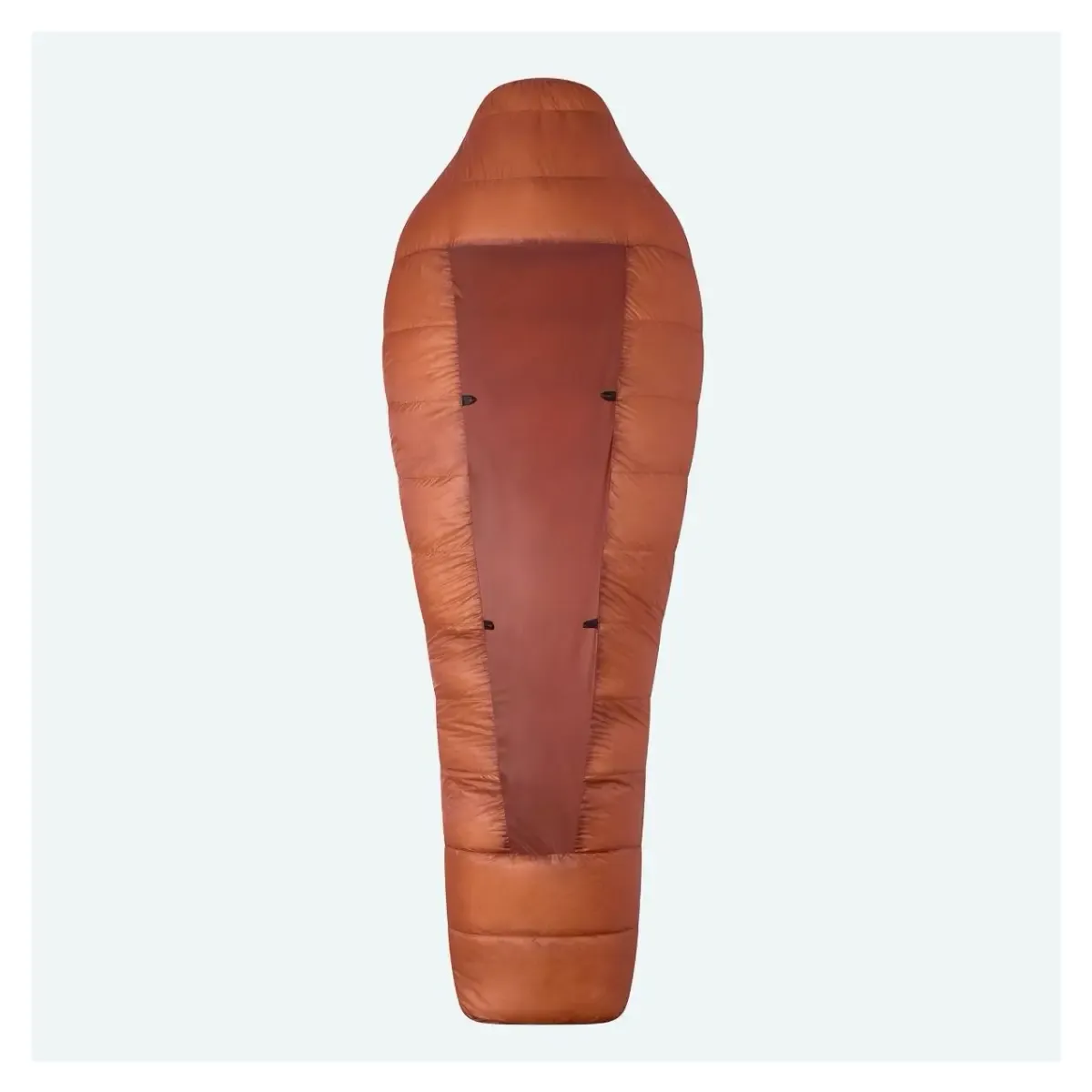 Konstrukcja z różnicowym krojem i komorami w kształcie „H” zapewnia równomierne rozłożenie puchu i minimalizuje straty ciepła. Trójwymiarowo uformowany kaptur z dwiema osobnymi sznurkami do ściągania pozwala na precyzyjne dopasowanie nawet w ciemności. Górna i dolna część śpiwora są napełniane osobno, co zwiększa kontrolę nad rozmieszczeniem izolacji. Brak zamka dodatkowo zmniejsza wagę i eliminuje straty ciepła. Dzięki prostemu systemowi mocowania można łatwo i szybko przymocować śpiwór do maty, dzięki czemu nie przesuwa się podczas snu.