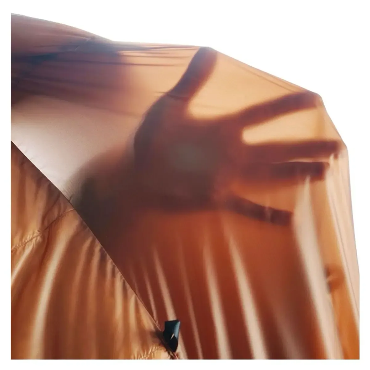 Producent sięgnął po sprawdzoną tkaninę Toray® Airtastic 19 g/m² (7D ripstop nylon), która doskonale łączy niską wagę, wytrzymałość, oddychalność i kompresyjność. Z zewnętrznej strony jest pokryta trwałą impregnowaną powłoką DWR, która niezawodnie chroni przed lekką kondensacją wilgoci powietrznej i kilkoma kroplami wody.