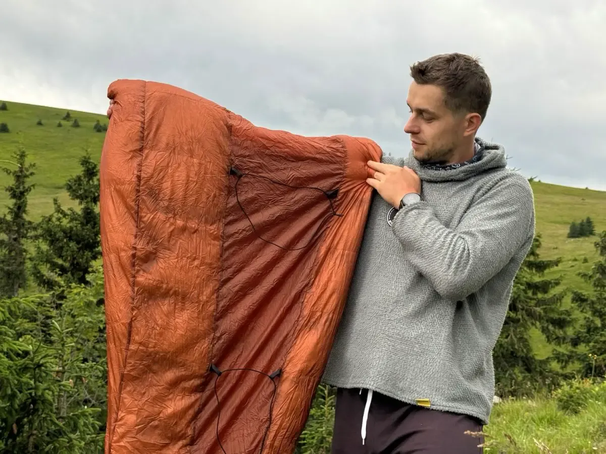Cumulus Aerial 250 ma hybrydową konstrukcję, która łączy zalety klasycznego śpiwora i quiltu. Aerial ma klasyczny kształt mumii zamkniętego śpiwora bez zamka błyskawicznego, ale w tylnej części pozbawiony jest puchowego wypełnienia i tworzy go tylko jedna warstwa tkaniny Toray Airtastic. Podobnie jak w quiltach, więc brakuje puchu na plecach, ponieważ sprężony puch traci loft, nie izoluje i praktycznie nie ma sensu. Od ziemi izoluje cię karimata, w przeciwieństwie do quiltu nie stykasz się z nią bezpośrednio.