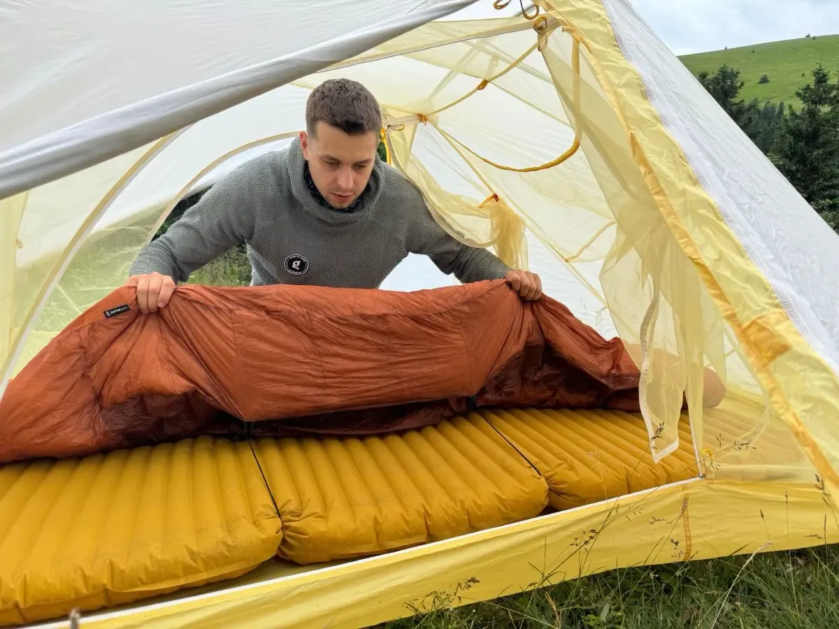 Aby śpiwór nie przesuwał się z tobą podczas wiercenia w nocy, przymocujesz go podobnie jak quilt za pomocą sznurków do karimaty. Ten prosty system mocowania zapewni, że śpiwór pozostanie przez cały czas w odpowiedniej pozycji, z częścią plecową na karimacie, a ty będziesz mógł się w nim swobodnie obracać.
