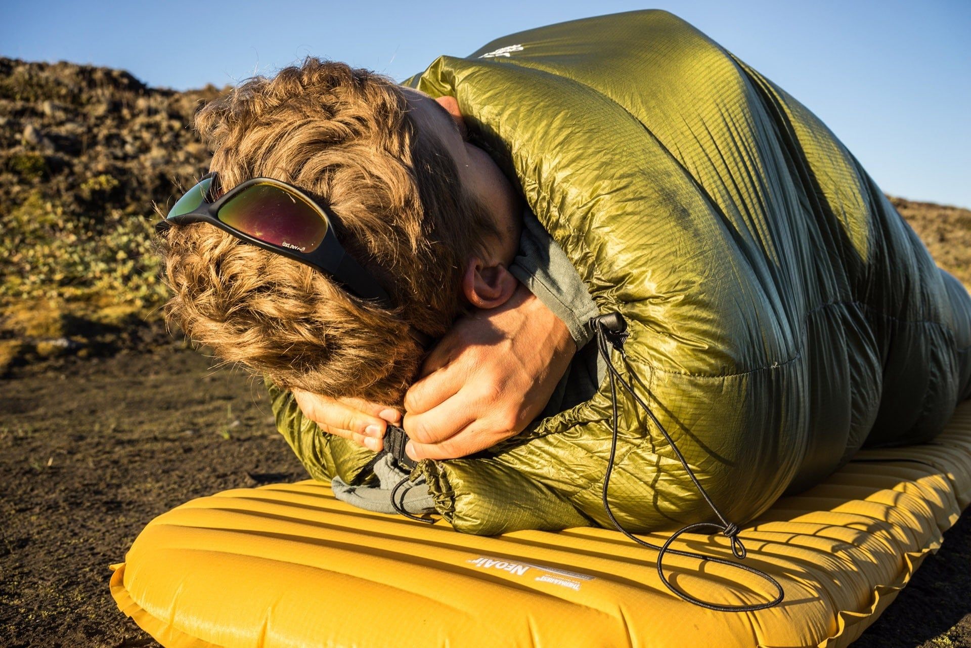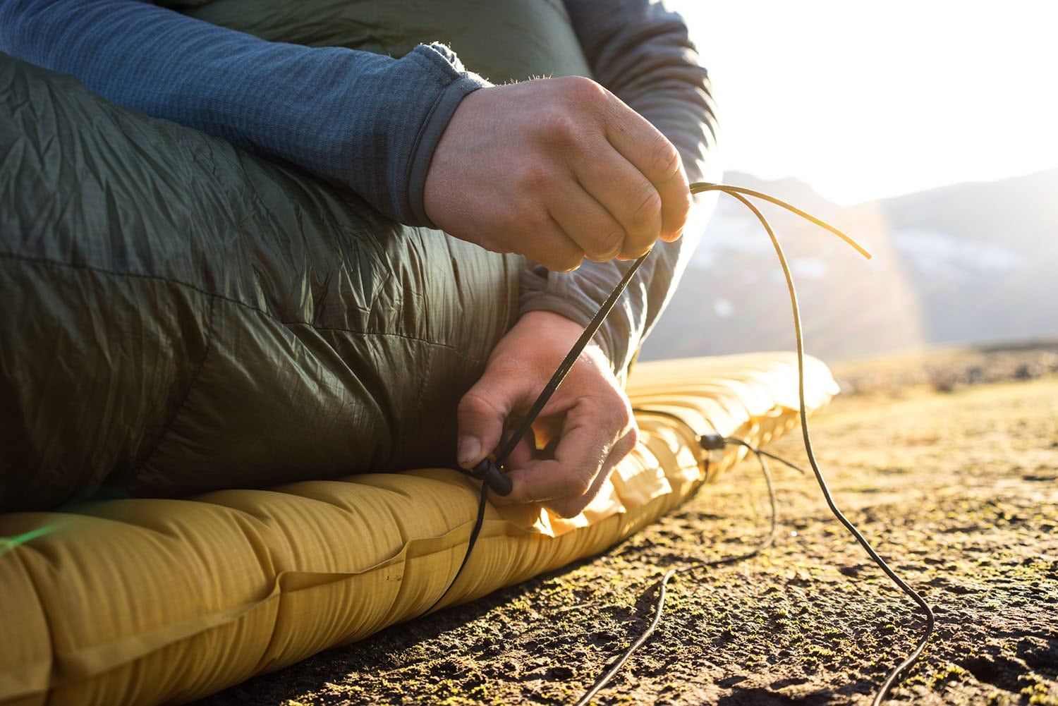 O izolację od ziemi zadba twoja karimatka. Żeby otwór na plecach pozostał przez cały czas pod tobą, quilt przyczepia się do karimatki za pomocą elastycznych pasków. Quilt pozostaje cały czas w podstawowej pozycji, a ty się w nim obracasz. Quilt można używać z jakimkolwiek typem karimatki (nadmuchiwana, piankowa). Quilt nie ma kaptura, możesz go zastąpić czapką lub kurtką puchową/blużą z kapturem.