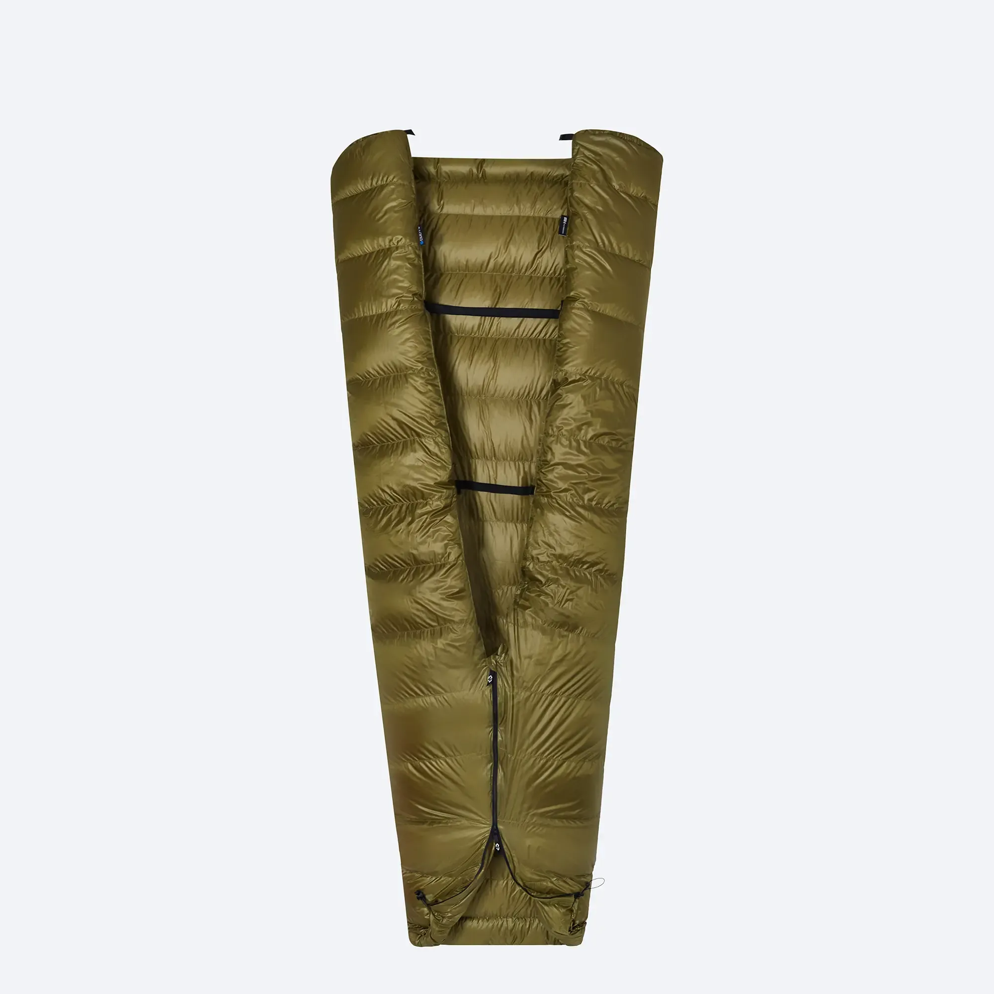 Aby zaoszczędzić na wadze i zwiększyć efektywność, quilty pozbawiono wszystkiego, co niepotrzebne. Na tylnej stronie, od pasa w górę, usunięto nieefektywnie wykorzystany puch, który przez większość czasu byłby spłaszczony pod twoim ciałem i praktycznie nie miałby żadnego sensu.