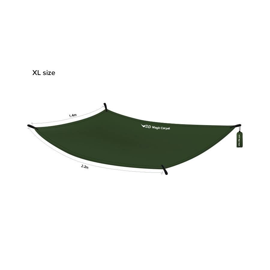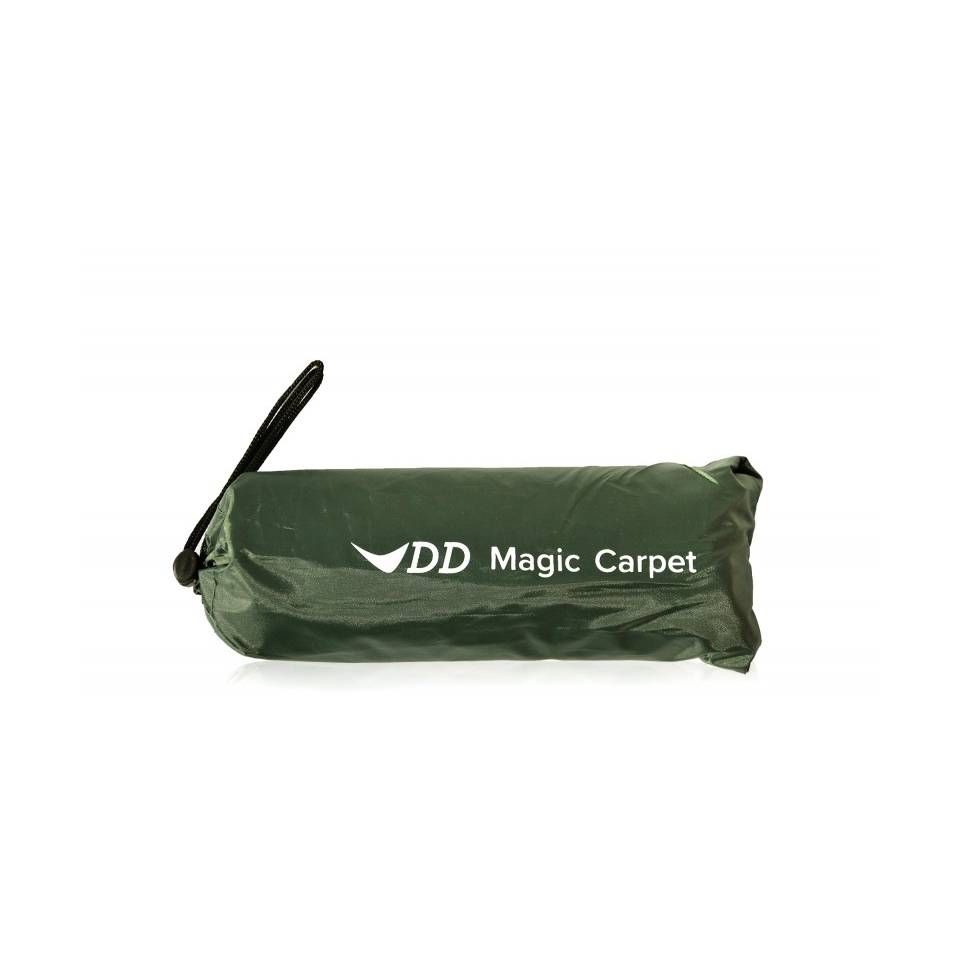 Wodoodporna płachta z czterema punktami mocowania, którą możesz wykorzystać jako podłogę do namiotu (footprint) lub awaryjne schronienie. Jej rozmiar jest wystarczający, aby mogły na niej leżeć dwie osoby. DD Hammacks Magic Carpet jest wykonany z nylonu ripstop z PU powłoką o słupie wody 3000 mm.