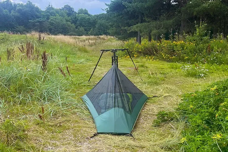 Moskitiera waży mniej niż 500 gramów (razem z tarpem waga zestawu to poniżej 1 kg), a po spakowaniu zajmuje minimum miejsca – idealna dla bikepackerów i minimalistów na długodystansowych szlakach. Oprócz użycia z rowerem możesz rozstawić moskitierę także samodzielnie, kiedy tylko masz do dyspozycji kij trekkingowy albo gałąź do zawieszenia.