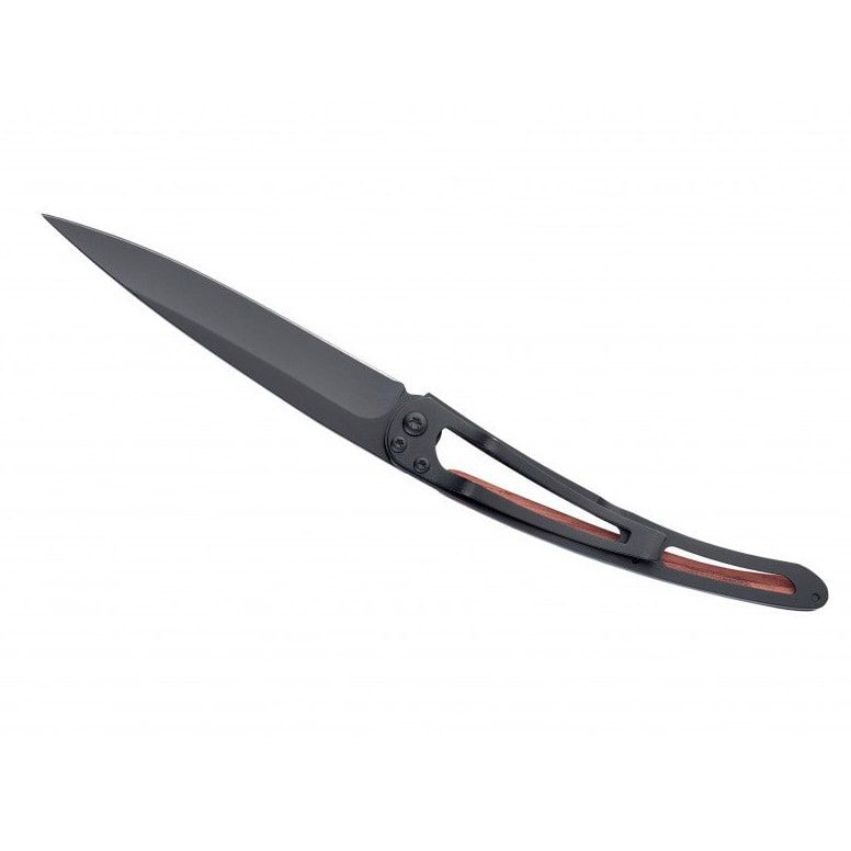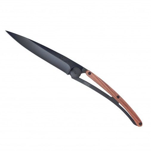 Ultralekkie i minimalistyczne noże francuskiej marki deejo są idealne w podróże, na trekkingi i wycieczki. Dostępne są w trzech rozmiarach (15 g, 27 g, 37 g) i różnych wariantach wykonania. Ten nóż składany ma 9,5 cm długie ostrze w eleganckim czarnym kolorze, rękojeść z okładziną z egzotycznego drewna Coralwood, blokadę oraz klips do przypięcia.
