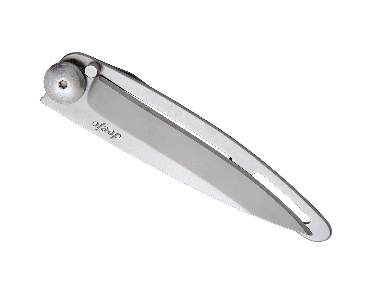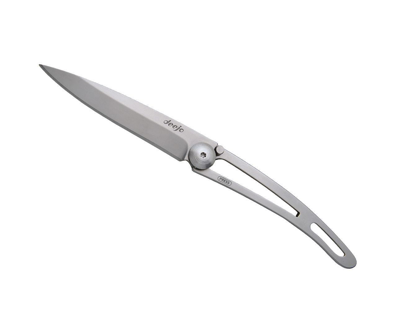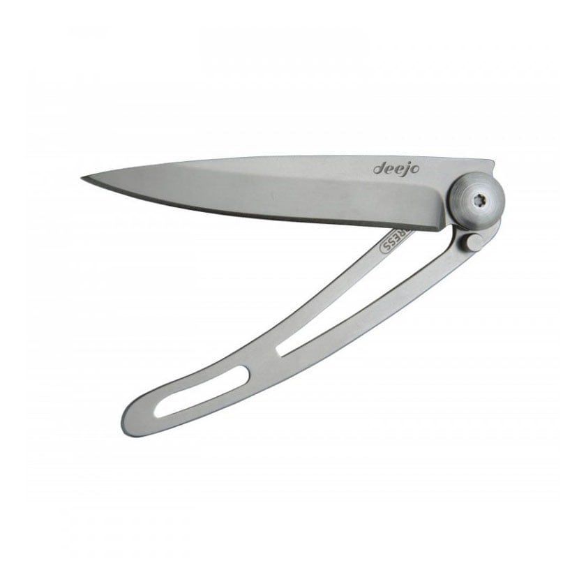 Ultralekkie i minimalistyczne noże francuskiej marki deejo są idealne w podróż, na trekkingi i wycieczki. Dostępne są w trzech rozmiarach (15 g, 27 g, 37 g) i w różnych wersjach wykonania. Nóż składany Naked 27g składa się z ostrza o długości 8 cm, rękojeści, blokady oraz klipsa do przypięcia.