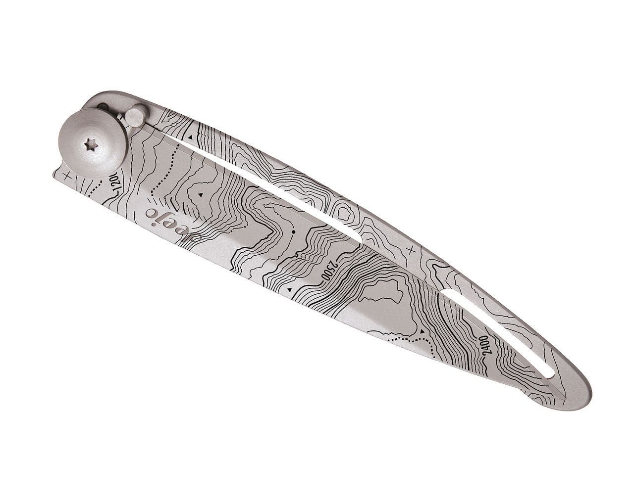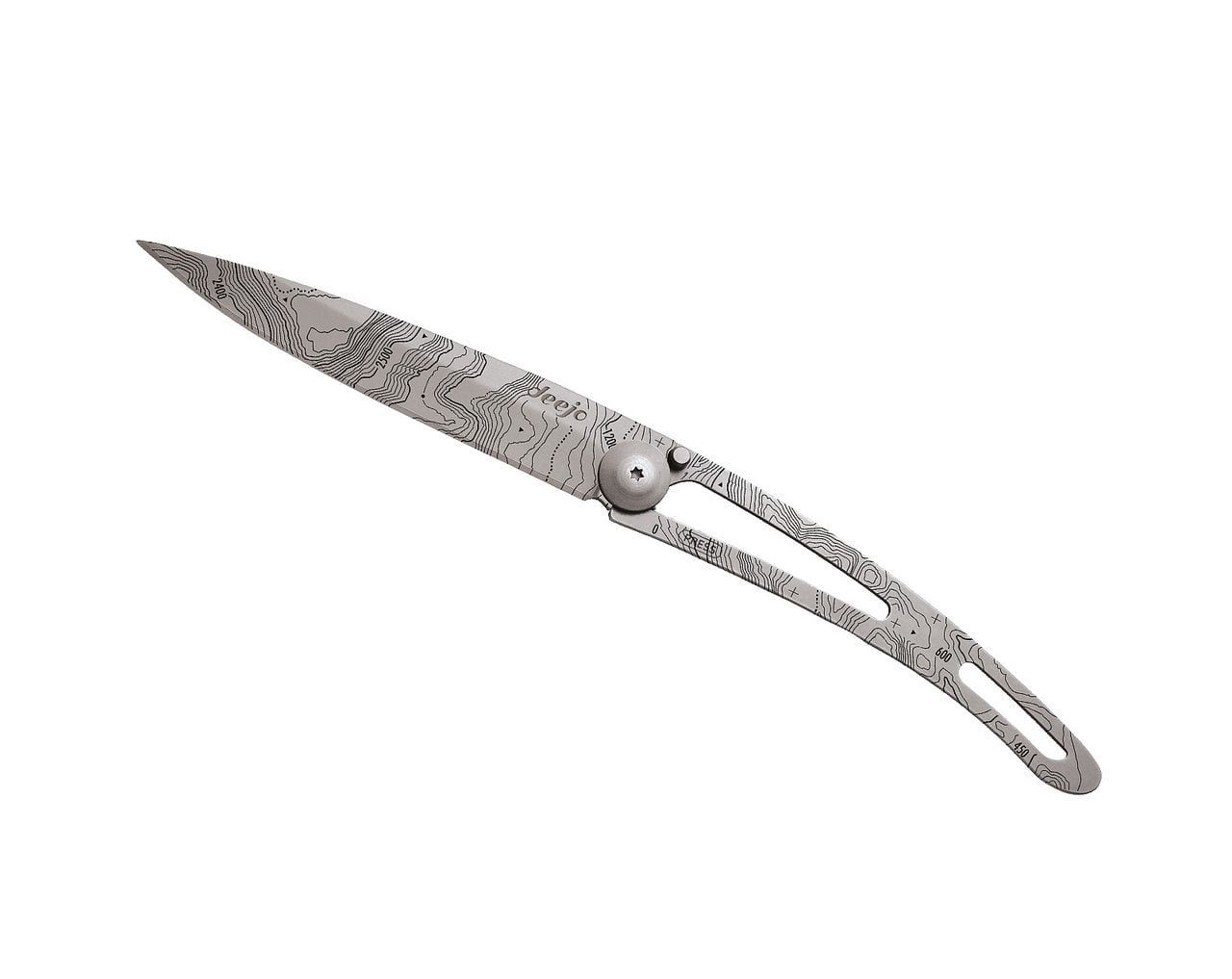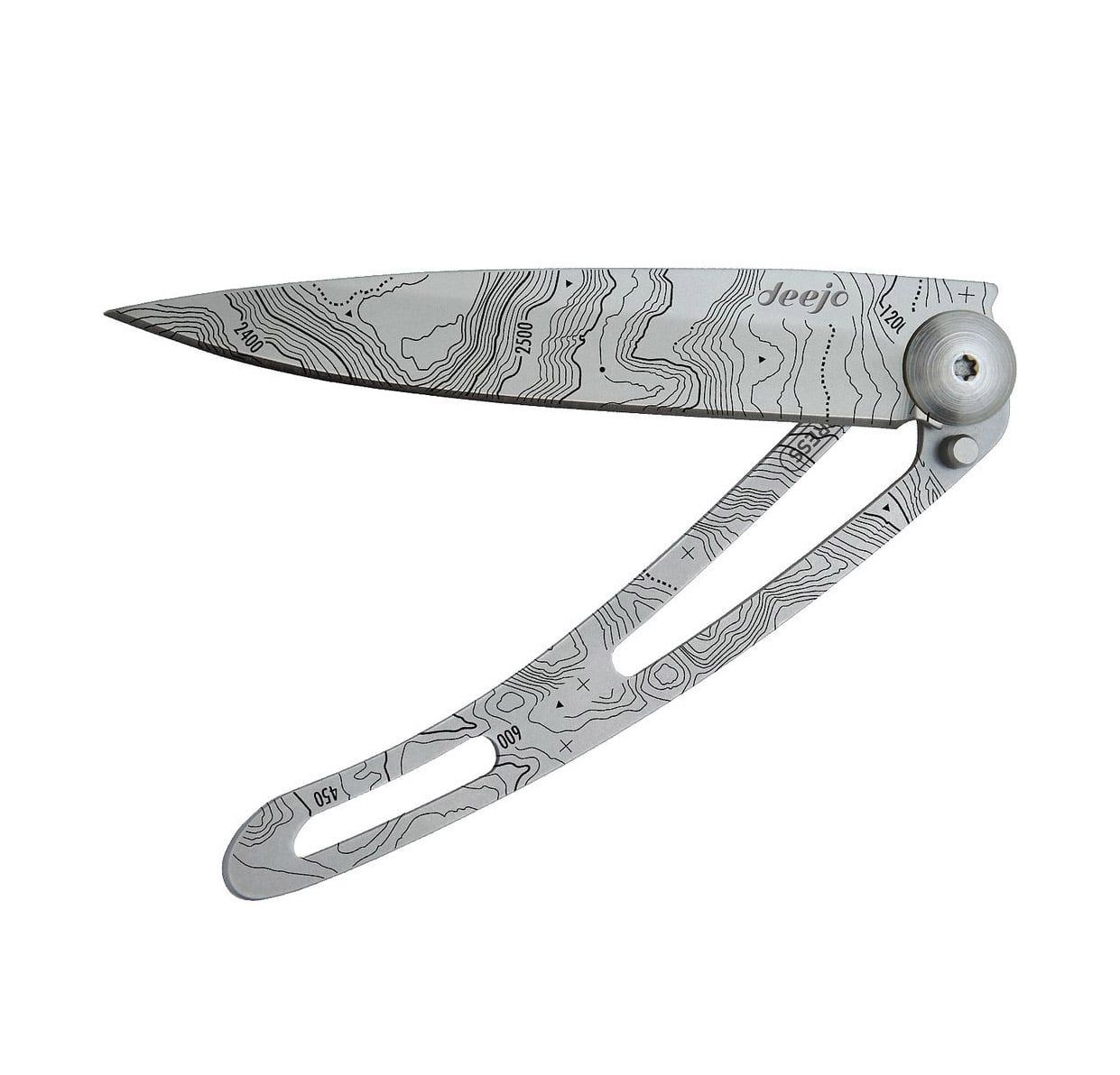 Ultralekkie i minimalistyczne noże francuskiej marki deejo są idealne w podróży, na trekking i wycieczki. Dostępne są w trzech rozmiarach (15 g, 27 g, 37 g) i w różnych wariantach wykończenia. Naked 37g Tattoo Topography to największa wersja noży kieszonkowych, złożona z ostrza o długości 9,5 cm, rękojeści, blokady i klipsa do przypięcia.