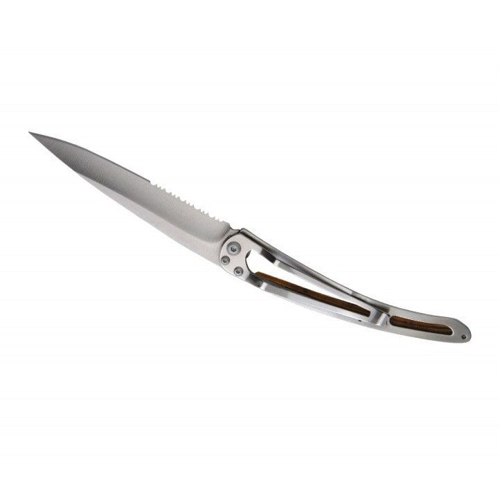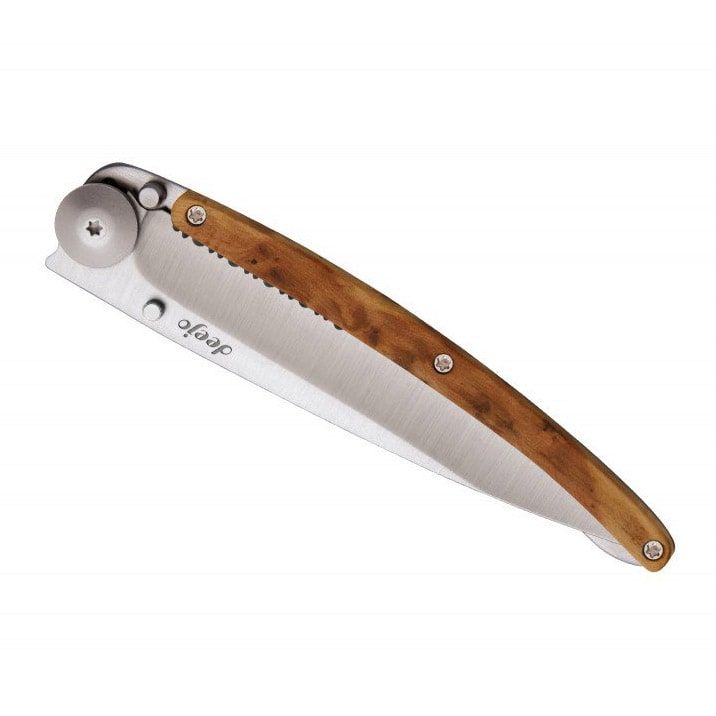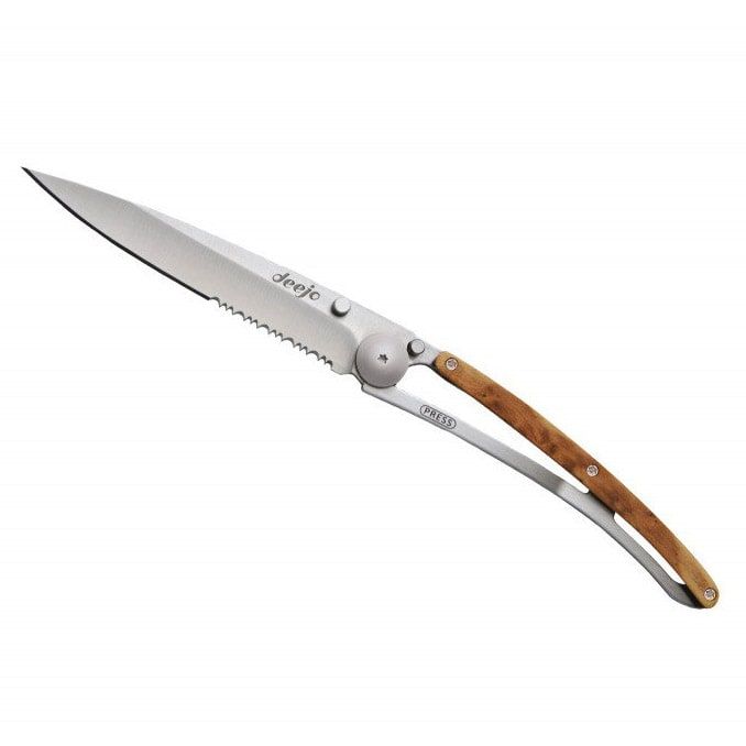 Ultralekkie i minimalistyczne noże francuskiej marki Deejo są idealne w podróży, na trekking i wycieczki. Dostępne są w trzech rozmiarach (15 g, 27 g, 37 g) i różnych wariantach wykonania. Ten nóż wyróżnia się częściowo ząbkowanym ostrzem o długości 9,5 cm, rękojeścią z okładziną z egzotycznego jałowca, blokadą oraz klipsem do przypięcia.