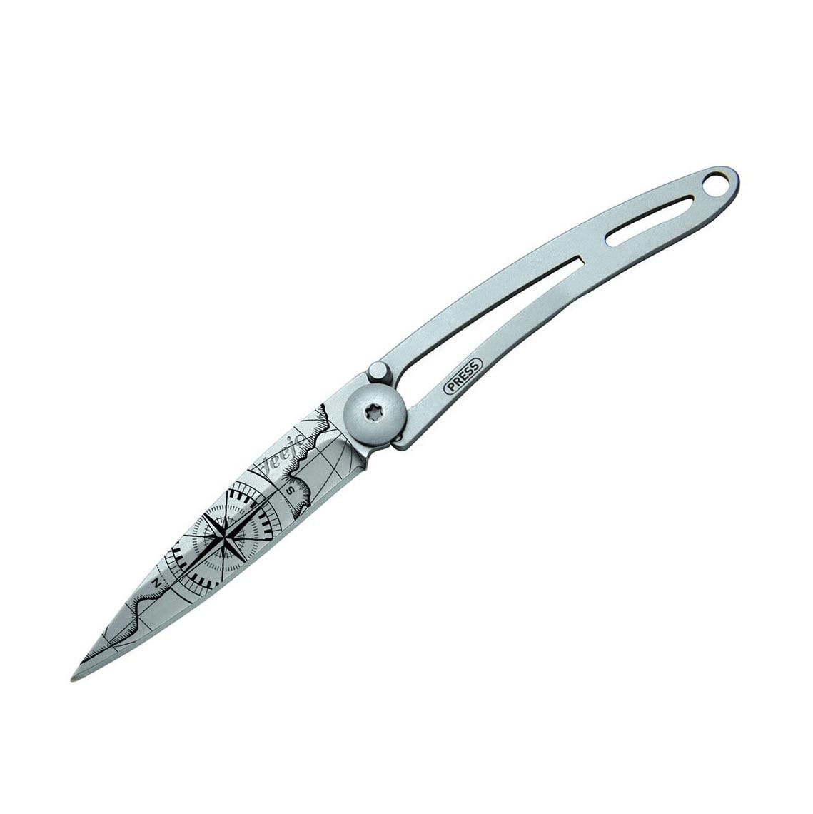 Ultralekkie i minimalistyczne noże francuskiej marki Deejo są idealne w podróży, na trekkingi i wycieczki. Dostępne są w trzech rozmiarach (15 g, 27 g, 37 g) i różnych wariantach wykończenia. Wersja Tattoo 15g Terra Incognita Naked ma na ostrzu laserowo wygrawerowany motyw „Terra Incognita”.