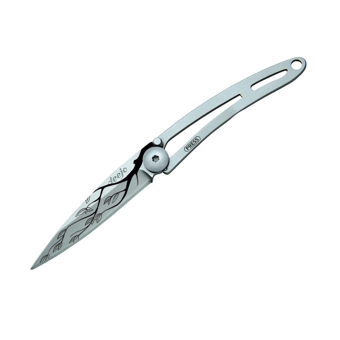 Ultralekkie i minimalistyczne noże francuskiej marki deejo są idealne w podróże, na trekkingi i wycieczki. Dostępne są w trzech rozmiarach (15 g, 27 g, 37 g) i różnych wariantach wykonania. Wersja Tattoo 15g Tree Naked ma na klindze laserowo wygrawerowany motyw drzewa i składa się wyłącznie z głowni, rękojeści oraz blokady.