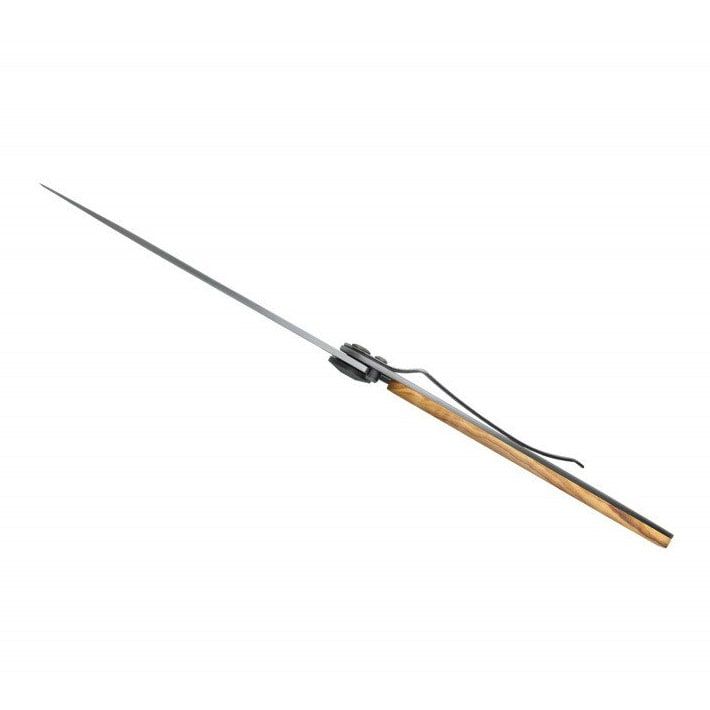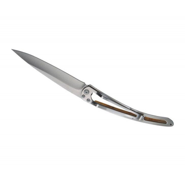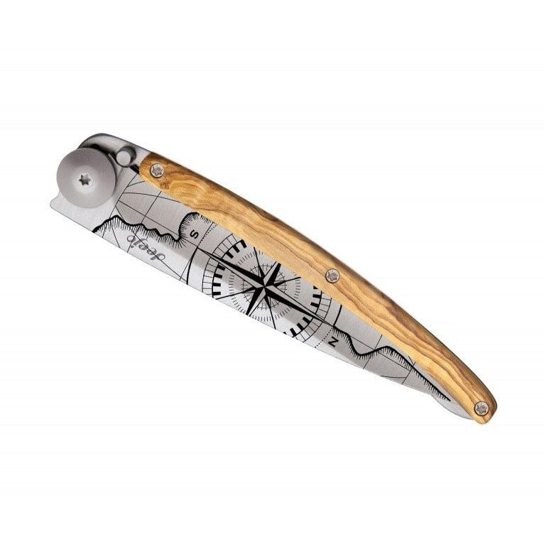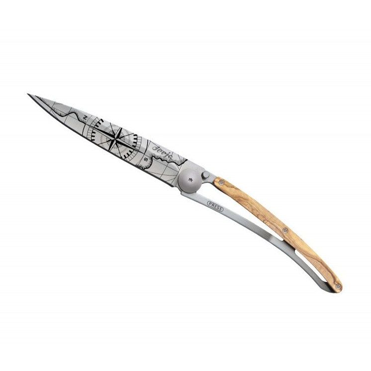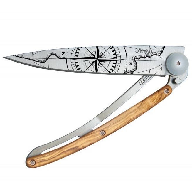 Ultralekkie i minimalistyczne noże francuskiej marki deejo są idealne w podróży, na trekking i wycieczki. Dostępne są w trzech rozmiarach (15 g, 27 g, 37 g) i w różnych wersjach wykończenia. Ten nóż wyróżnia się laserowo grawerowanym motywem „Země neznámá”, okładziną z drewna oliwnego, ostrzem o długości 9,5 cm, ergonomiczną rękojeścią, blokadą oraz klipsem do mocowania.