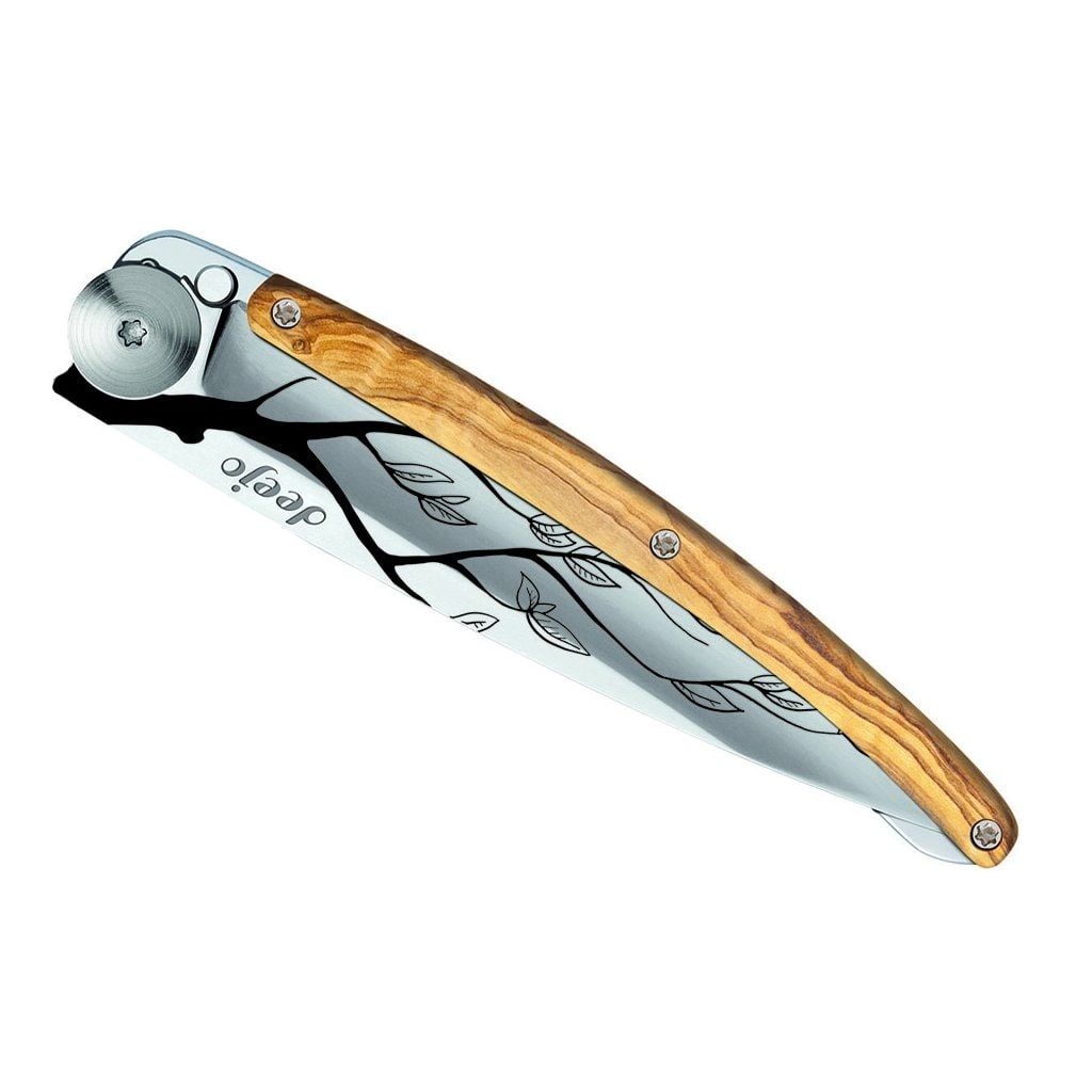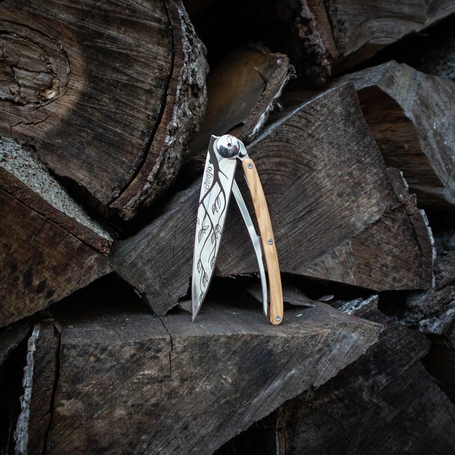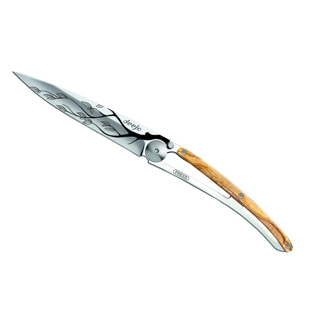 Ultralekkie i minimalistyczne noże francuskiej marki Deejo są idealne w podróży, na trekking i wycieczki. Dostępne są w trzech rozmiarach (15 g, 27 g, 37 g) i w różnych wariantach wykonania. Ten nóż wyróżnia się laserowo grawerowanym motywem drzewa, okładziną rękojeści z drewna oliwnego, błyszczącym ostrzem o długości 9,5 cm, rękojeścią, blokadą i klipsem do przypięcia.