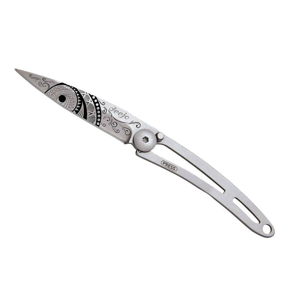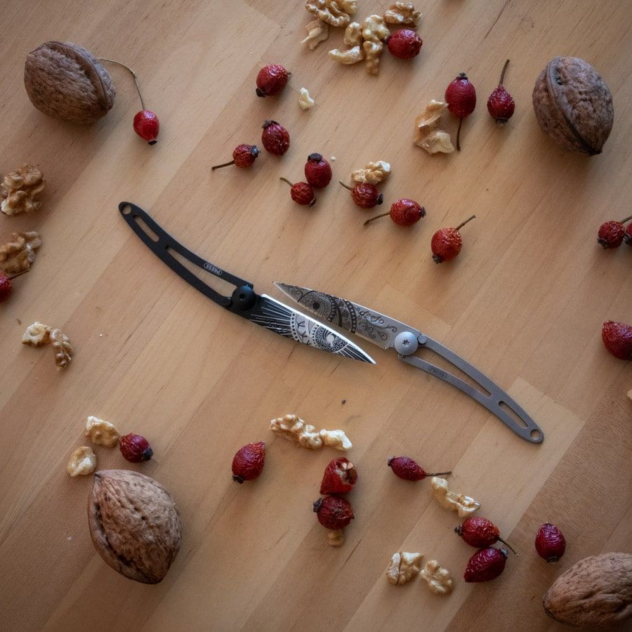 Seria Black wyróżnia się eleganckim czarnym kolorem. Rękojeść nie ma tu okładzin. Dzięki grawerowanemu motywowi w pełni realizuje się to, co deejo niesie w swoim sloganie – „Nóż, który jest do ciebie podobny”. Niezawodna blokada zapewnia, że nóż w pozycji otwartej nie złoży się podczas użytkowania. Najmniejsza wersja 15 g jest idealnym wyborem dla tych, którzy w trakcie swoich wypraw potrzebują tylko okazjonalnego krojenia drobnych rzeczy, a jednocześnie zależy im na wadze i kompaktowych rozmiarach ekwipunku. W zestawie znajduje się również stalowa linka z zakręcanym zamknięciem, żebyś tak łatwo nie zgubił noża. Zapakowany w estetyczne pudełko prezentowe.