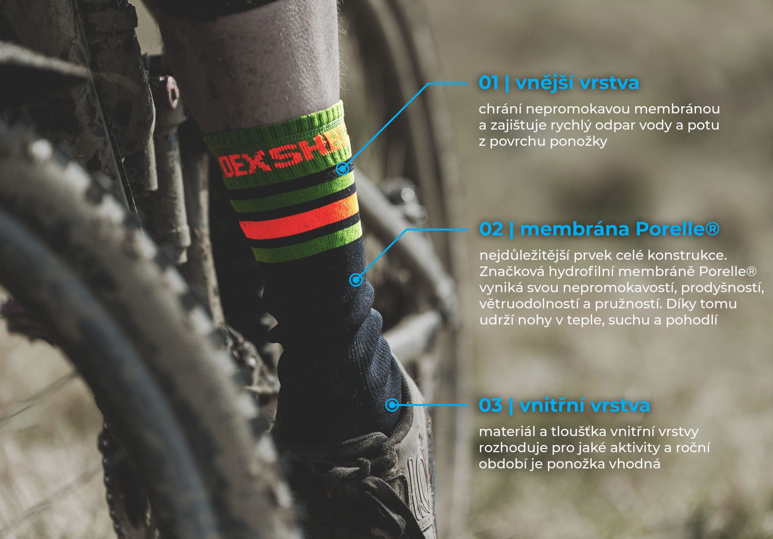 Wodoodporne skarpety zaprojektowane w outdoorowym stylu na ekstremalne warunki pogodowe. Zewnętrzna i wewnętrzna warstwa została wzbogacona wełną merino o naturalnych właściwościach antybakteryjnych. Skarpety zapewniają świetny komfort, maksymalne ciepło, ograniczają powstawanie nieprzyjemnego zapachu oraz pęcherzy w wymagających warunkach. Pomagają też skutecznie odprowadzać pot, co jest niezbędne, by przy intensywnym ruchu utrzymać stopy w suchości. Długością sięgają do połowy łydki, mają amortyzowaną część pod stopą z elastycznym wsparciem łuku stopy.