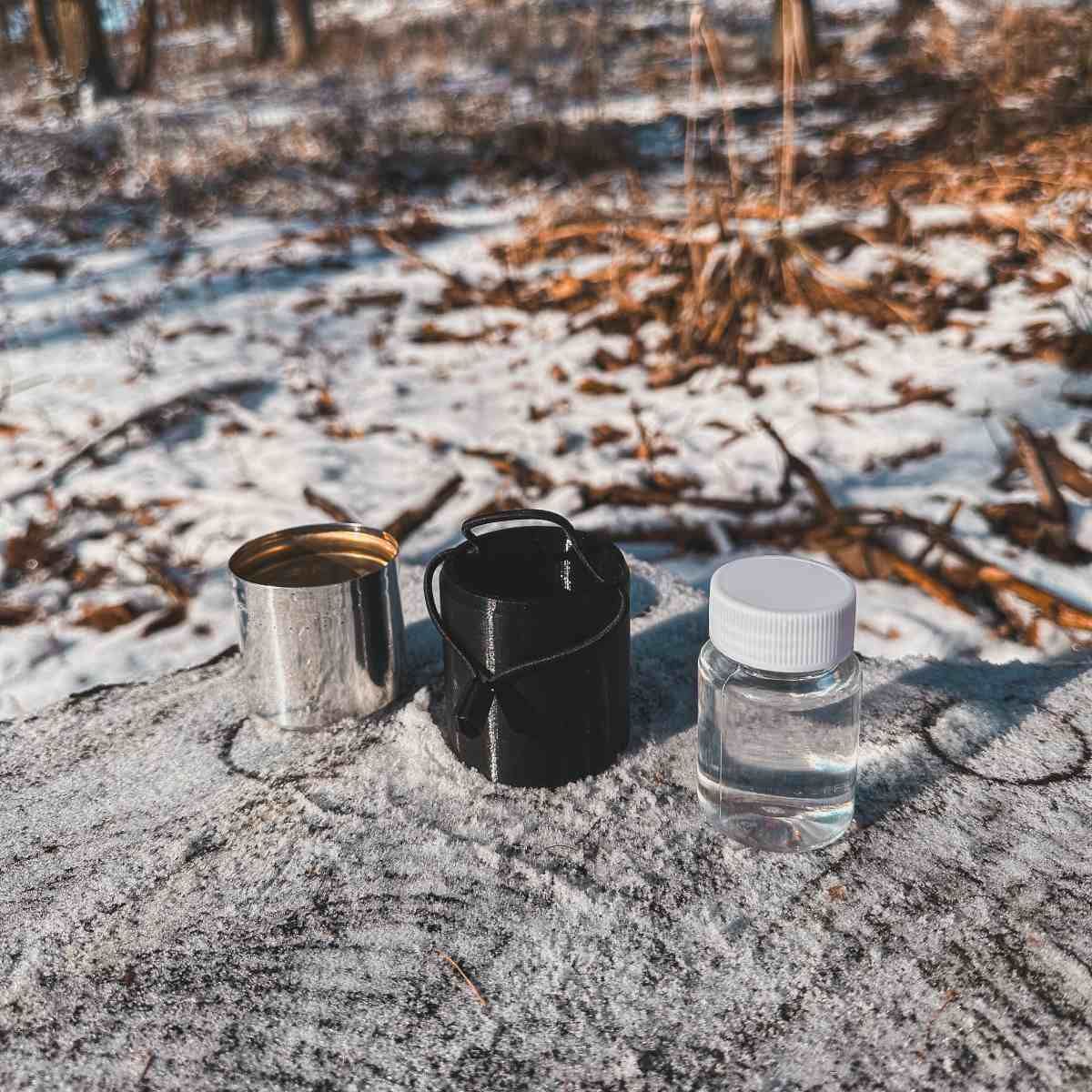 Czarna osłona ochronna została wykonana z plastiku, a dla większej wytrzymałości i lepszej ochrony kuchenki jest podwójna. Waży zaledwie 28 gramów i ma ściągającą gumkę, dzięki której kuchenka trzyma się w etui i nie wypadnie. Wymiary etui (80 mm x 60 mm) są dokładnie takie, żeby kuchenka idealnie w nie pasowała. Z drugiej strony etui wkłada się małą przezroczystą plastikową buteleczkę na ciekły alkohol z zakręcanym białym korkiem o wadze 13 gramów i pojemności 60 ml. Taka ilość alkoholu wystarcza na około pół godziny gotowania (15 ml paliwa pali się przez około 7-8 minut przy temperaturze otoczenia 25°C i bezwietrze).
