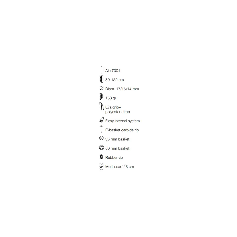 Kije są oznaczane jako najlżejsze aluminiowe, 3‑sekcyjne teleskopowe kije na świecie. Regulowane są za pomocą śrubowego zamka Flexy locking do długości 132 cm. Rękojeść wykonana jest z przyjemnej pianki EVA z regulowanym, zdejmowanym paskiem. Na końcu kija znajduje się wytrzymały węglikowy grot. Choć producent podaje wagę jednego kija 158 gramów, my zmierzyliśmy 163 gramy bez paska i 172 gramy z paskiem. Złożony kij ma 59,5 cm.