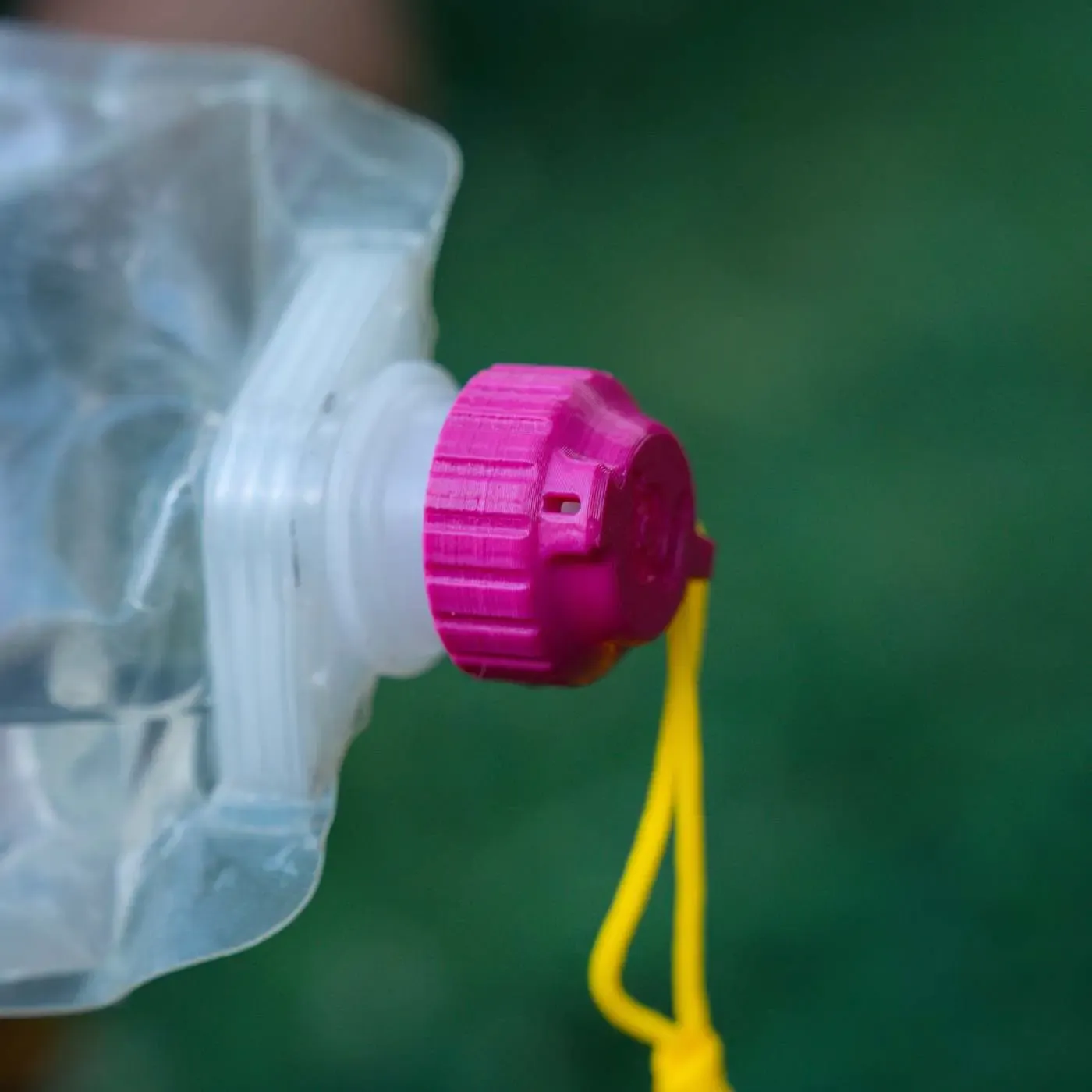 Zaprojektowaliśmy go tak, aby idealnie pasował do miękkich składanych butelek, takich jak Platypus, CNOC lub Sawyer – według nas to właśnie one sprawdzają się najlepiej, bo można je wielokrotnie ściskać bez odkształcania. Jednocześnie pasują też do większości standardowych butelek PET (np. Rajec, Magnesia, Coca-Cola, Dobrá voda). Przed wyjazdem zalecamy sprawdzić kompatybilność.