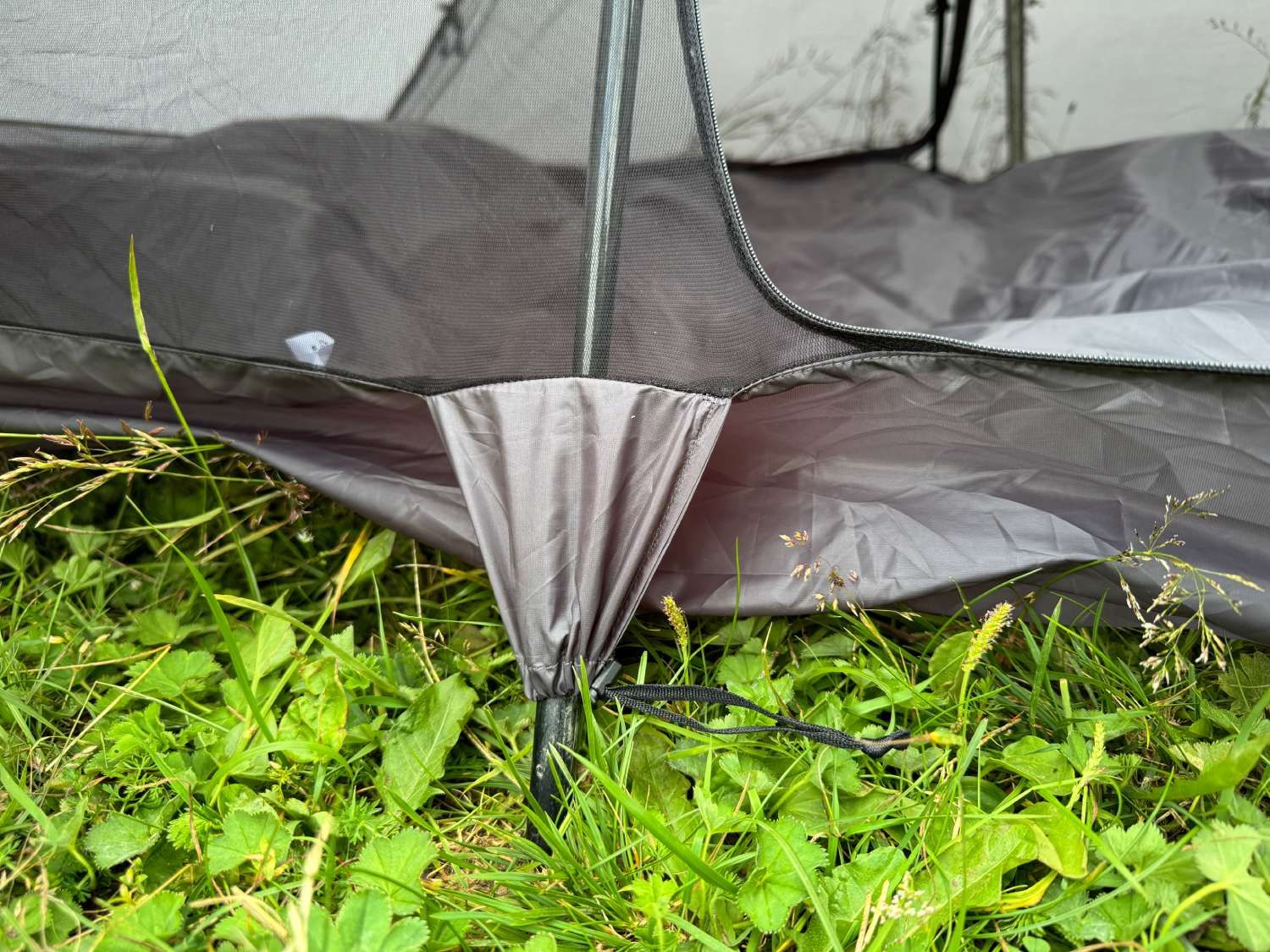 Budowa namiotu jest naprawdę prosta – wystarczy wbić śledzie w rogi, włożyć kije trekkingowe do kieszeni, wbić śledzie przedsionka i w razie potrzeby napiąć dodatkowe linki.