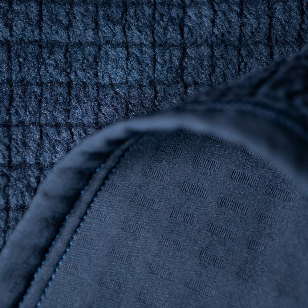 Od wewnętrznej strony oddychające czesane włókno z podwójną, kratkowaną strukturą, a od zewnętrznej strony gładka i wytrzymała powierzchnia.