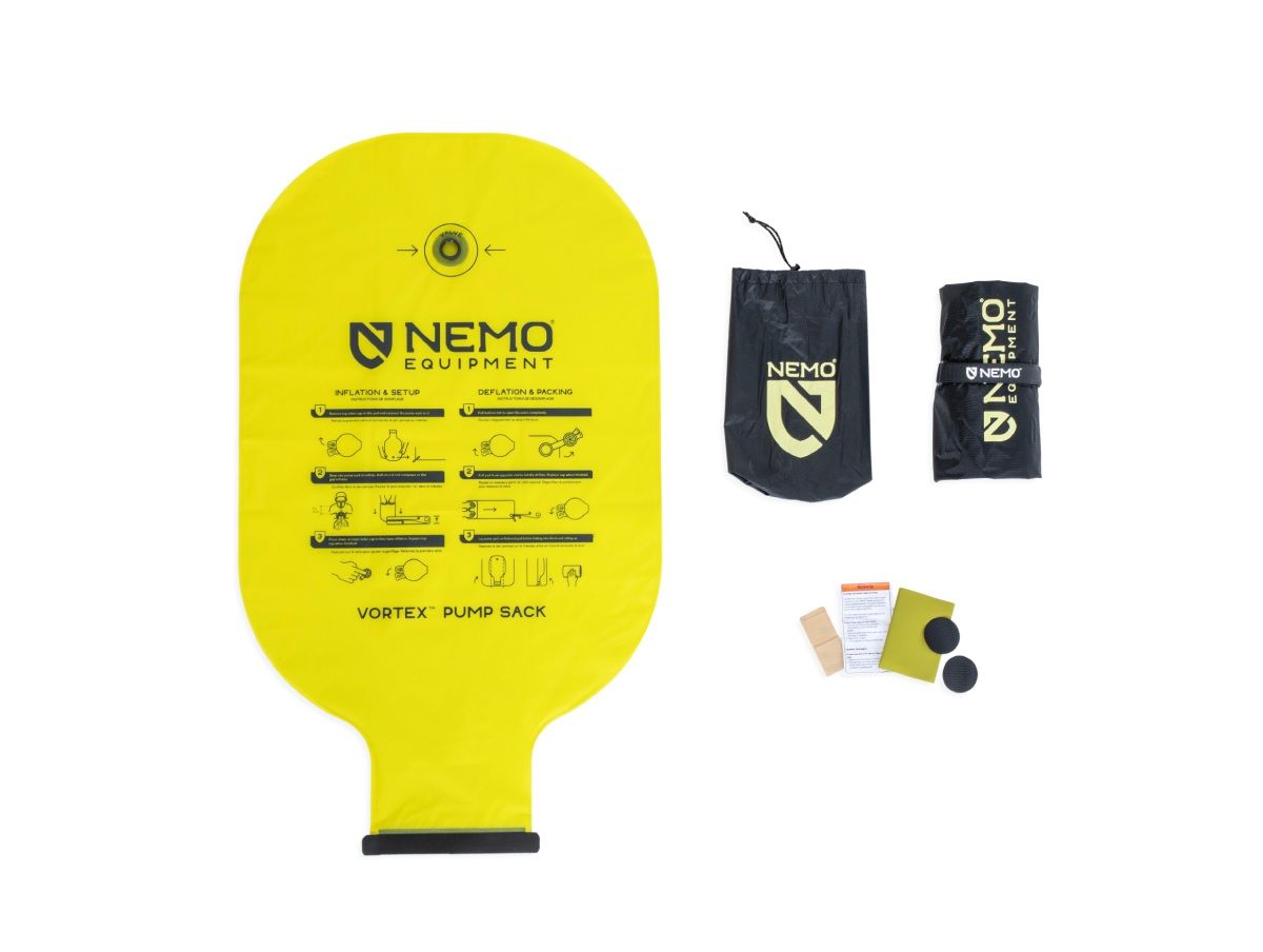 Do samej karimatki dostaniesz w zestawie także zestaw naprawczy, taśmę na rzep do złożonej karimatki, mały worek na przechowywanie oraz duży nadmuchiwany worek Vortex do szybkiego i łatwego nadmuchania.