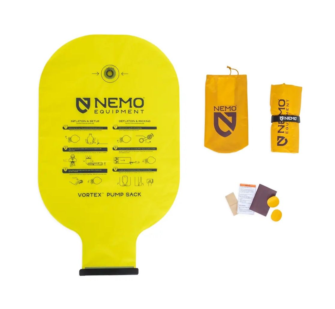 Do karimatki dostaniesz w pakiecie też zestaw naprawczy, taśmę na rzep do zaciśnięcia złożonej karimatki, mały worek do przechowywania oraz dużą nadmuchiwaną torbę Vortex do szybkiego i łatwego nadmuchiwania.