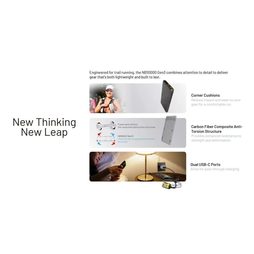 Nowa generacja najlżejszej power bank na świecie (150 g) wykonanej z utwardzanego polimeru z domieszką włókna szklanego, co zmniejsza jej zużycie. NB10000 GEN3 jest teraz wyposażona w narożne poduszki, ponadto oferuje wyższą moc ładowania oraz automatycznie wykrywany tryb niskiego prądu.