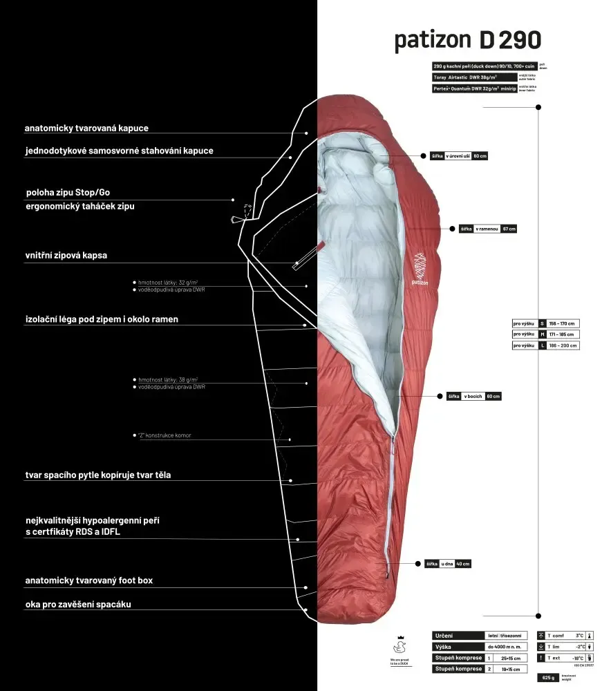 Ulepszona wersja popularnej serii śpiworów czeskiego producenta Patizon, która teraz jest wykonana z połączenia materiałów Pertex i Toray. Zachowuje niską wagę, właściwości izolacji termicznej, niesamowity komfort i kompresyjność, a jednocześnie zwiększa odporność. Model D 290 to idealny wybór na lato, cieplejszą wiosnę i jesień.