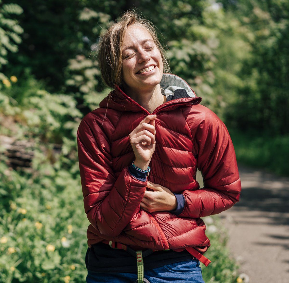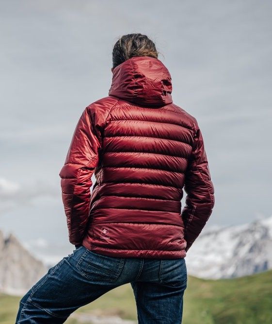 W miejscach, gdzie potrzebna jest większa swoboda ruchu, lepsza oddychalność lub wytrzymałość (ramiona, boki, kołnierz, kaptur i dolna część pleców), zastosowano syntetyczną izolację Climashield Eco 75 g/m z surowców z recyklingu. Nie wymaga ona przeszywania komór, bardzo dobrze izoluje, a jednocześnie znacznie lepiej radzi sobie z wilgocią niż klasyczny puch. Pas syntetycznej izolacji poprowadzony wzdłuż boku kurtki aż do pachy i do końca rękawa jest bezpośrednio w okolicy pachy przerwany, co zwiększa swobodę ruchu oraz poprawia oddychalność i odprowadzanie potu. Syntetyczna, nieprzeszywana izolacja w dolnej części wydłużonego panelu tylnego oraz w okolicy ramion zwiększa odporność na zużycie podczas noszenia plecaka.