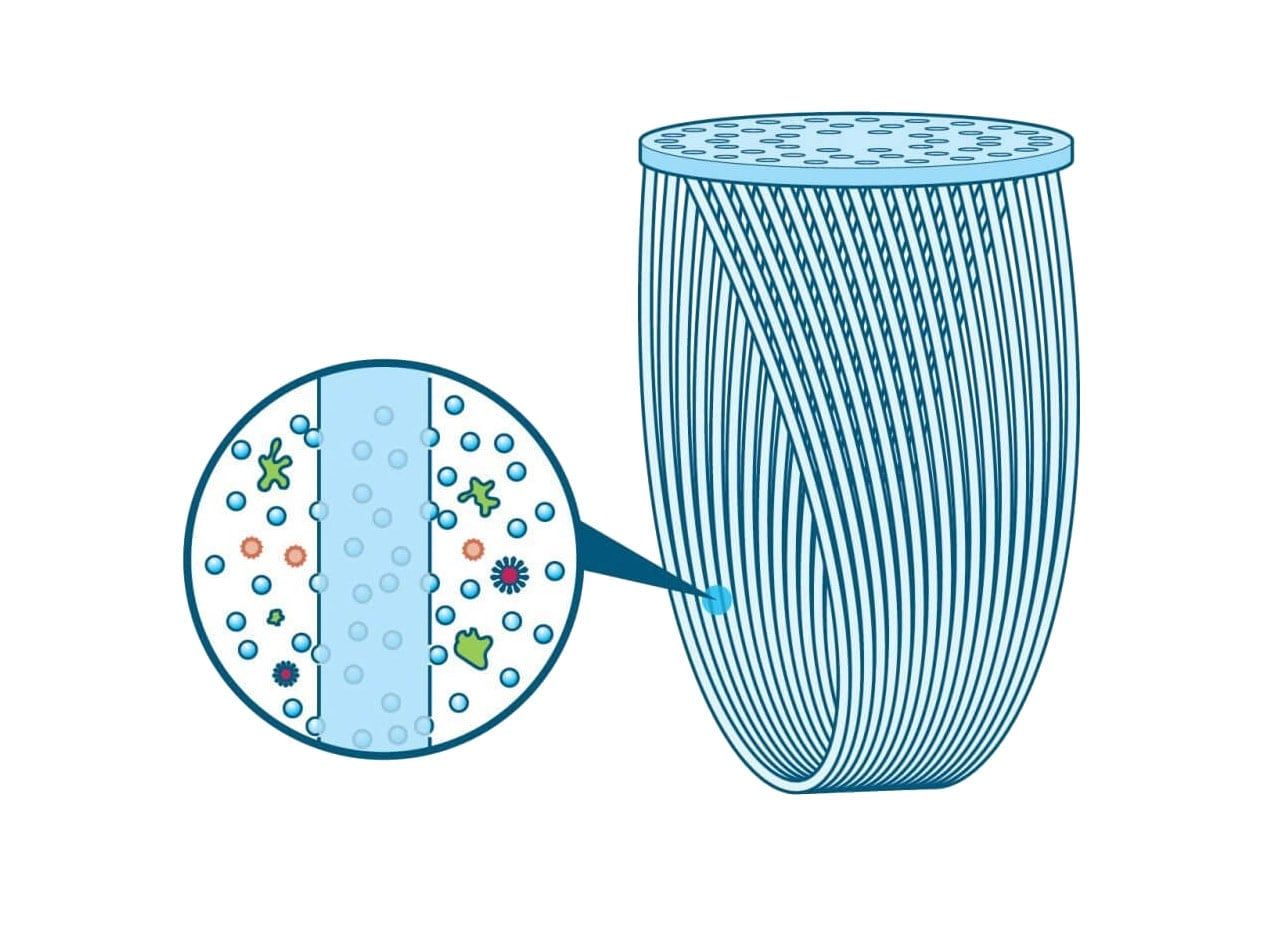 Filtr zawiera dużą ilość pustych mikro włókien w kształcie U, które zatrzymują zanieczyszczenia, a jednocześnie umożliwiają odpowiedni przepływ zdekontaminowanej wody. Rozmiar porów to 0,1 mikrona, wszystko większe jest zatrzymywane w mikro włóknach. Filtr Sawyer Squeeze gwarantuje odfiltrowanie 99,99999 % wszystkich szkodliwych dla zdrowia bakterii (Salmonella, cholera, E. coli, itp.), pierwotniaków (Giardia i Cryptosporidium) oraz 100 % zatrzymanie mikroplastików.