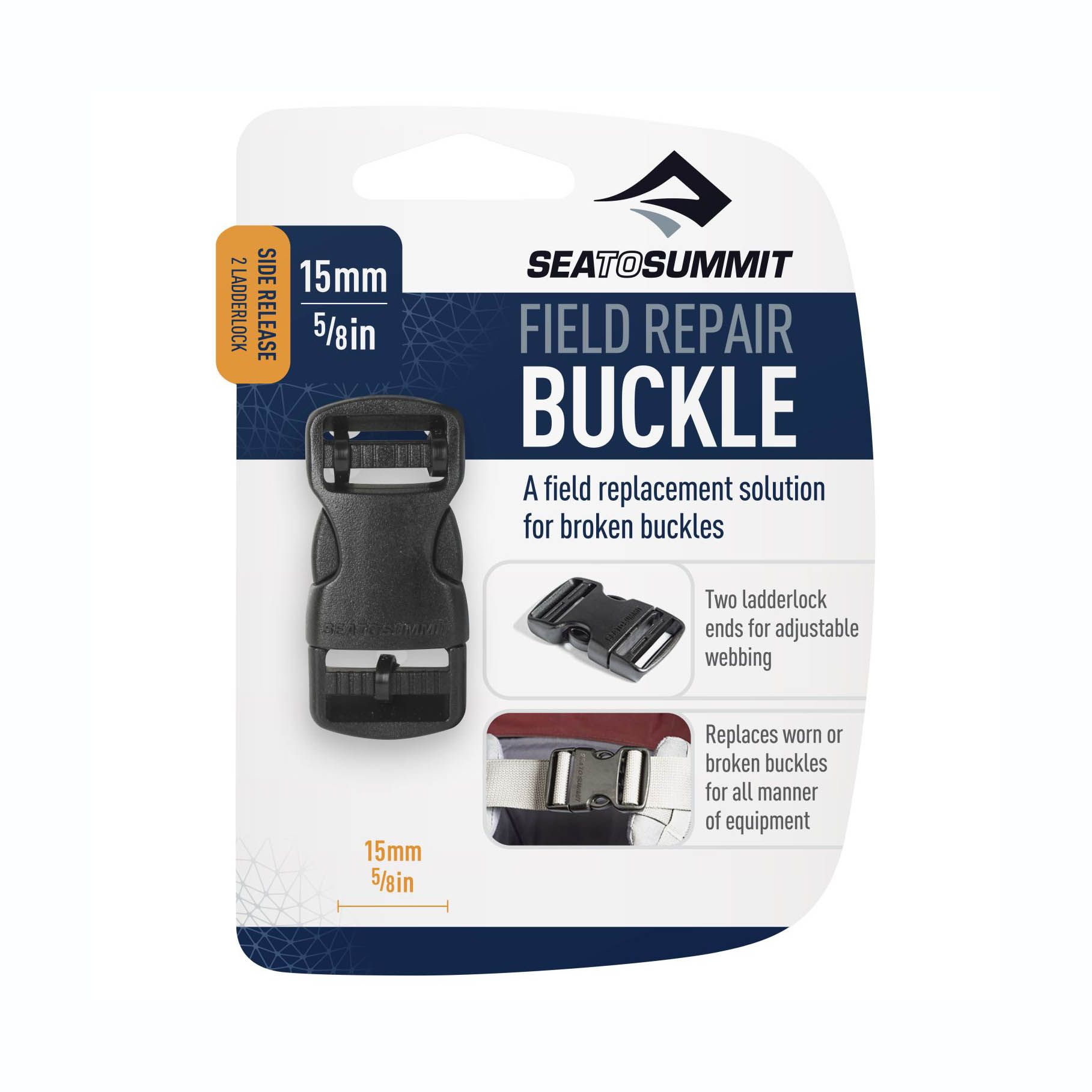 Field Repair Buckle to zapasowa klamra umożliwiająca łatwą i szybką wymianę uszkodzonych lub wyraźnie zużytych klamer na taśmach, na przykład w plecaku. Dostępna w kilku rozmiarach, dopasowanych do różnych szerokości taśm – 15 mm, 20 mm, 25 mm, 38 mm i 50 mm.
