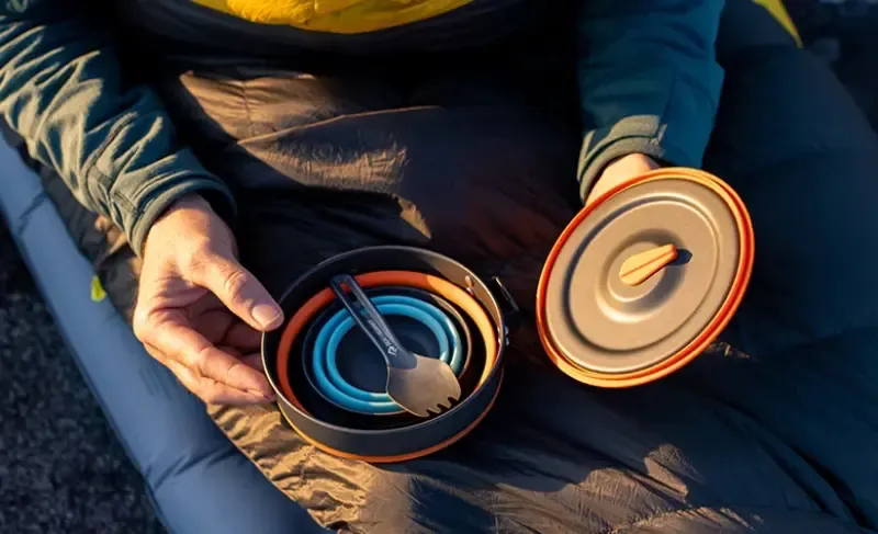 Garnek jest wykonany z silikonu spożywczego z anodowanym aluminiowym dnem i pokrywką. Możesz w nim podgrzewać wodę do zalania dehydratów i gotować własne jedzenie na bazie wody. Garnka jednak nie nadaje się do smażenia, jego dno nie ma nieprzywierającej powłoki, a olej mógłby osiągnąć temperatury, które mogłyby uszkodzić garnek.