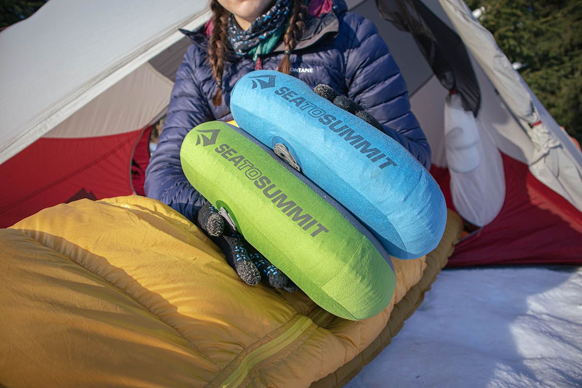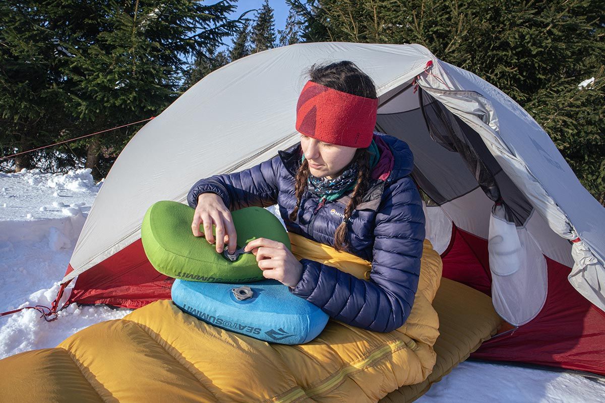 Jeśli masz jedną z nowszych mat Sea To Summit, na pewno docenisz system Pillow Lock™. Poduszka dzięki przyczepnej powierzchni „przykleja się” do maty i w nocy nie będzie ci uciekać. Poduszki nie można prać w pralce. Czyści się ją ręcznie, gąbką i ciepłą wodą, przy zamkniętym zaworze.