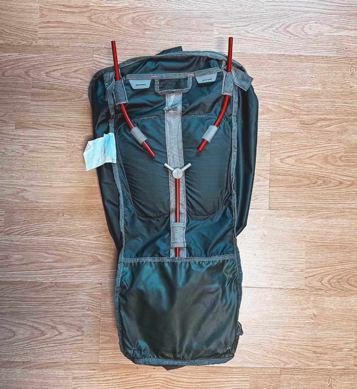Na początku musisz wyciągnąć wewnętrzne wzmocnienie z "kieszeni" wewnątrz plecaka pod klapą. Następnie możesz rozebrać wzmocnienie w miejscu, gdzie łączą się wszystkie 3 pręty konstrukcji Y. Potem wyciągnij wzmocnienie z rękawa na pasie biodrowym, przewlecz paski przez klamry plecaka i możesz wyjąć pas biodrowy. W odwrotnej kolejności zamontujesz nowy pas biodrowy.