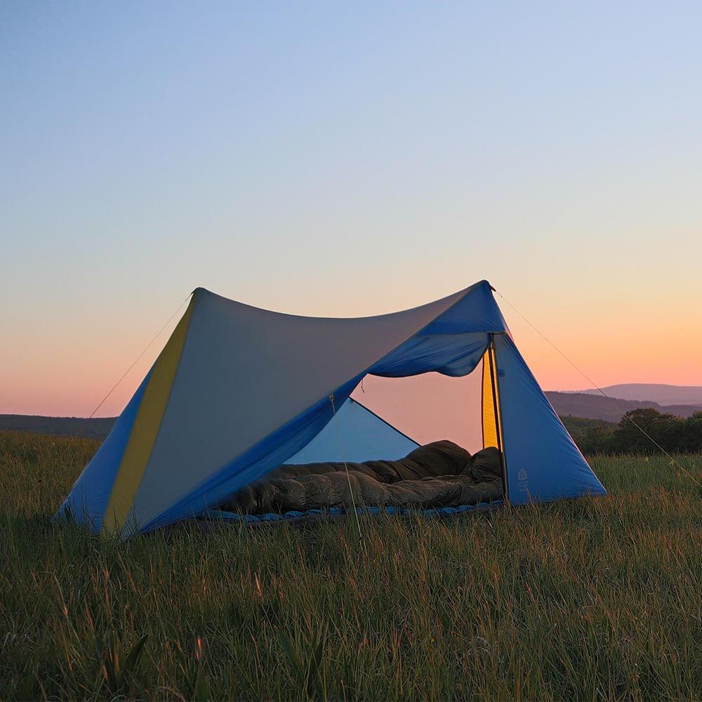 Tropik jest skonstruowany z 20D Nylon Ripstop. Zaleta jest taka, że nie czeka cię tu żadne podklejanie szwów. Wszystkie szwy są już podklejone. Budowa jest bardzo prosta – zakotwisz rogi, włożysz kijki trekkingowe i ewentualnie przypniesz moskitierę (nie jest częścią pakietu). Do budowy potrzebujesz minimum 6 śledzi i dwóch kijków trekkingowych regulowanych przynajmniej do 119 cm. Namiot można w wietrze napiąć za pomocą dwóch linek nad wejściami.