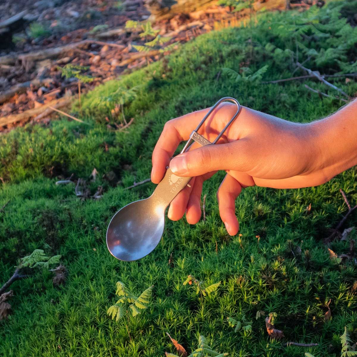 Ultralekka składana łyżka z polerowaną częścią nabierającą. Dzięki zastosowaniu tytanu łyżka jest wytrzymała i odporna na korozję. Po rozłożeniu zablokujesz ją suwakiem, który przesuniesz w stronę łyżki. Jej główna zaleta to kompaktowość – bez problemu spakujesz ją do garnka razem z kuchenką i kartuszem.