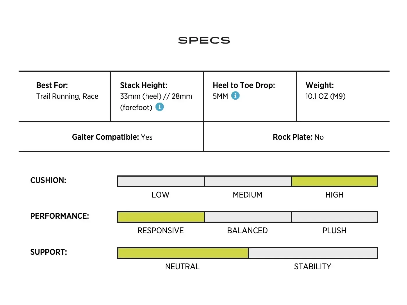Buty MTN Racer 3 mają drop 5 mm, który łączy bardziej naturalne lądowanie stopy z wystarczającym wsparciem i wygodą podczas biegu w zróżnicowanym terenie. Dzięki ulepszonemu wyprofilowaniu w przedniej części dodatkowo ułatwiają szybkie przejście do wybicia i zapewniają płynniejszy, bardziej efektywny bieg. Jeśli szukasz buta z zerowym dropem dla jeszcze bardziej naturalnego ruchu, zobacz na przykład model Pursuit 2.