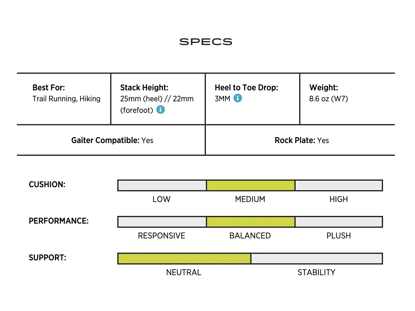 szeroki, przestronny toe box, wytrzymała tkana cholewka, międzypodeszwa z pianki z pamięcią ZipFoam™, płyta ochronna Rock Plate, przyczepna podeszwa z Vibram® Megagrip, wkładka OrthoLite®, możliwość mocowania getrów